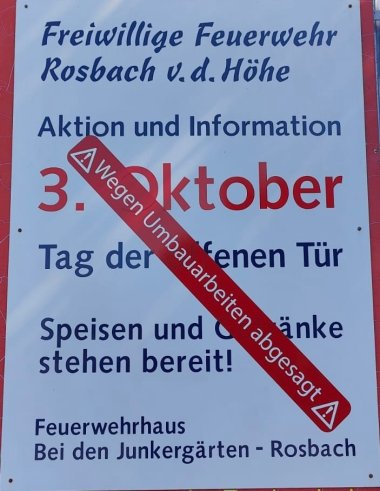 Der Förderverein und die Wehrführung der Feuerwehr Rosbach haben sich sehr auf den bevorstehenden Tag der offenen Tür gefreut. Leider ist es in diesem Jahr aufgrund der umfangreichen Sanierungsarbeiten nicht möglich, die Tore für unsere Freunde, Kameradinnen, Kameraden und Gäste zu öffnen.