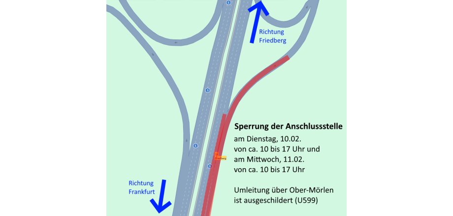 Für die Durchführung der Arbeiten muss die Abfahrt von der Richtungsfahrbahn Frankfurt in Richtung Friedberg gesperrt werden. Zusätzlich wird der rechte Fahrstreifen im Bereich der Anschlussstelle Friedberg gesperrt.